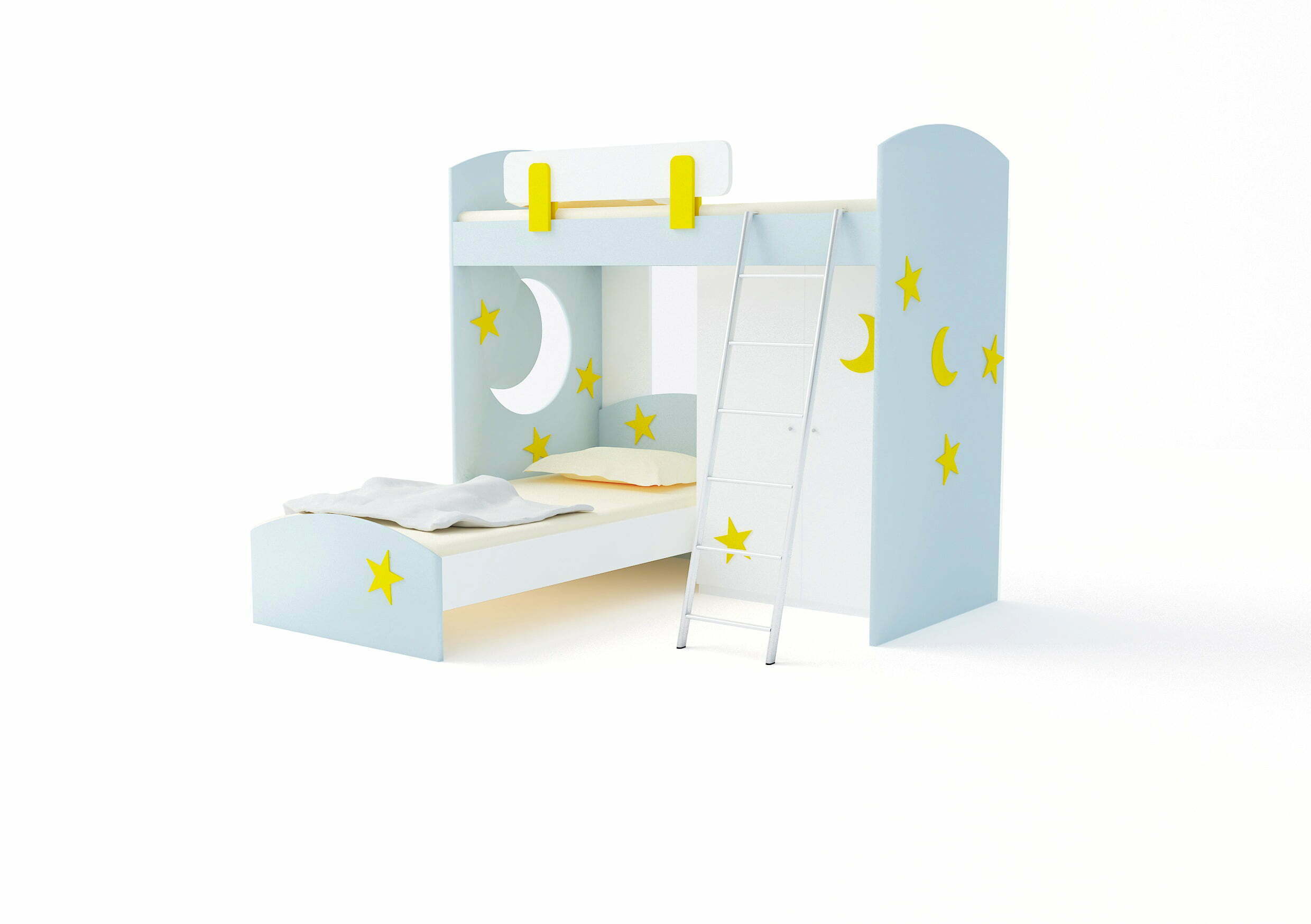Κουκέτα multiform Erica με άνοιγμα φεγγάρι, διακοσμητικά ταμπλαδάκια, ντουλάπα δίφυλλη και κάθετα τοποθετημένο κρεβάτι στο κάτω μέρος.
