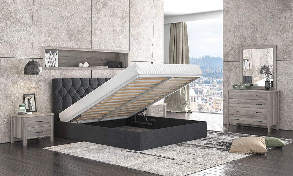 Υπάρχει δυνατότητα επιλογής διάστασης για στρώμα 160χ200 και 150χ200. Έχουμε μηχανισμό για ανύψωση σομιέ-τελάρο με πυκνό τελάρο, δημιουργώντας έτσι ένα μεγάλο αποθηκευτικό χώρο. Τα πλαϊνά του κρεβατιού είναι μέχρι κάτω και ακουμπάνε το πάτωμα.