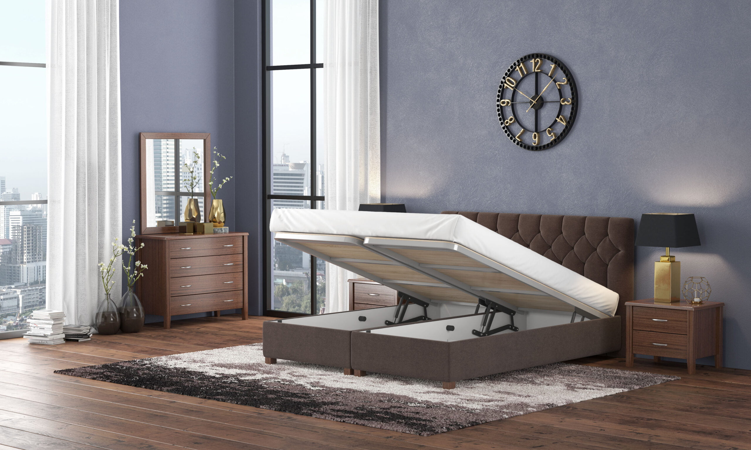 Επίσης, περιλαμβάνει δύο Box με ανατομικό τελάρο και μπουκάλες ανύψωσης ώστε να έχετε έναν επιπλέον αποθηκευτικό χώρο στο υπνοδωμάτιο σας. Υπάρχει κενό κάτω από το κρεβάτι για καθαριότητα.