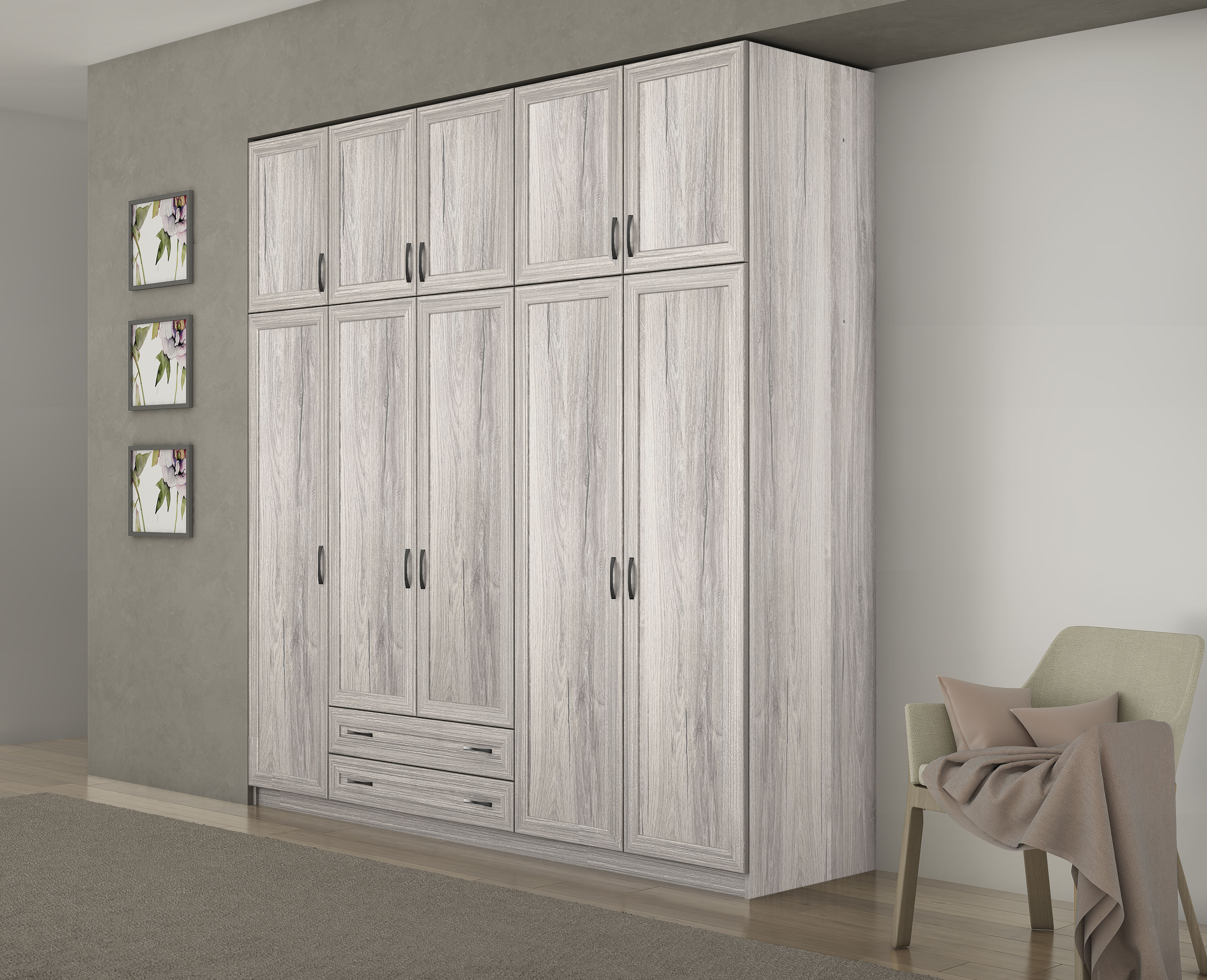 Ντουλάπα 5φυλλη με πατάρι και 2 συρτάρια από μελαμίνη καλής ποιότητας , ελληνικής κατακευής σε χρώματα μελί, σταχτί, μόκα, δρυς σκούρο, λάττε και καρυδί και σε διαστάσεις Φ252 χ Β60 χ Υ233. Η ντουλάπα με νταμπλά έχει επιπλέον χρέωση.